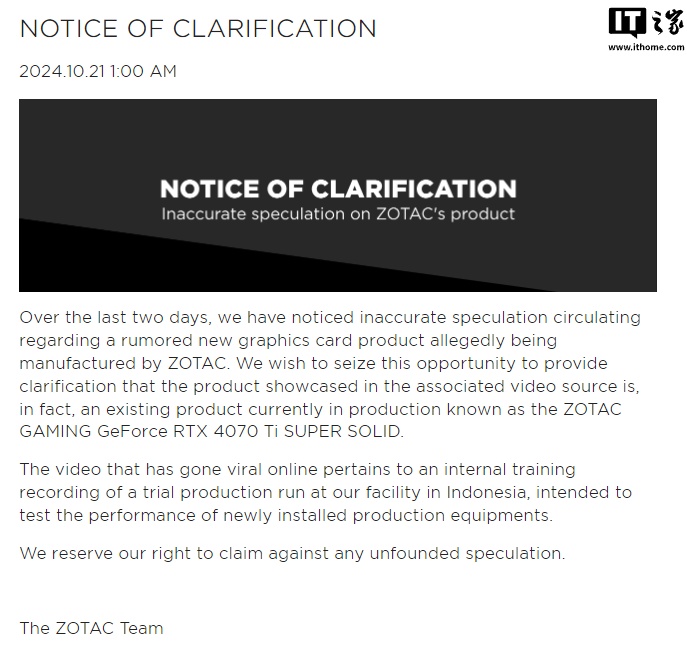 本公司最近关注到网上有不实传言,指 ZOTAC 正在制造新型显卡产品。本公司在此澄清,于相关片段中出现的产品,实指公司已生产良久的 ZOTAC GAMING GeForce RTX 4070 Ti SUPER SOLID 显卡,并非如谣言所指的新型显卡。
