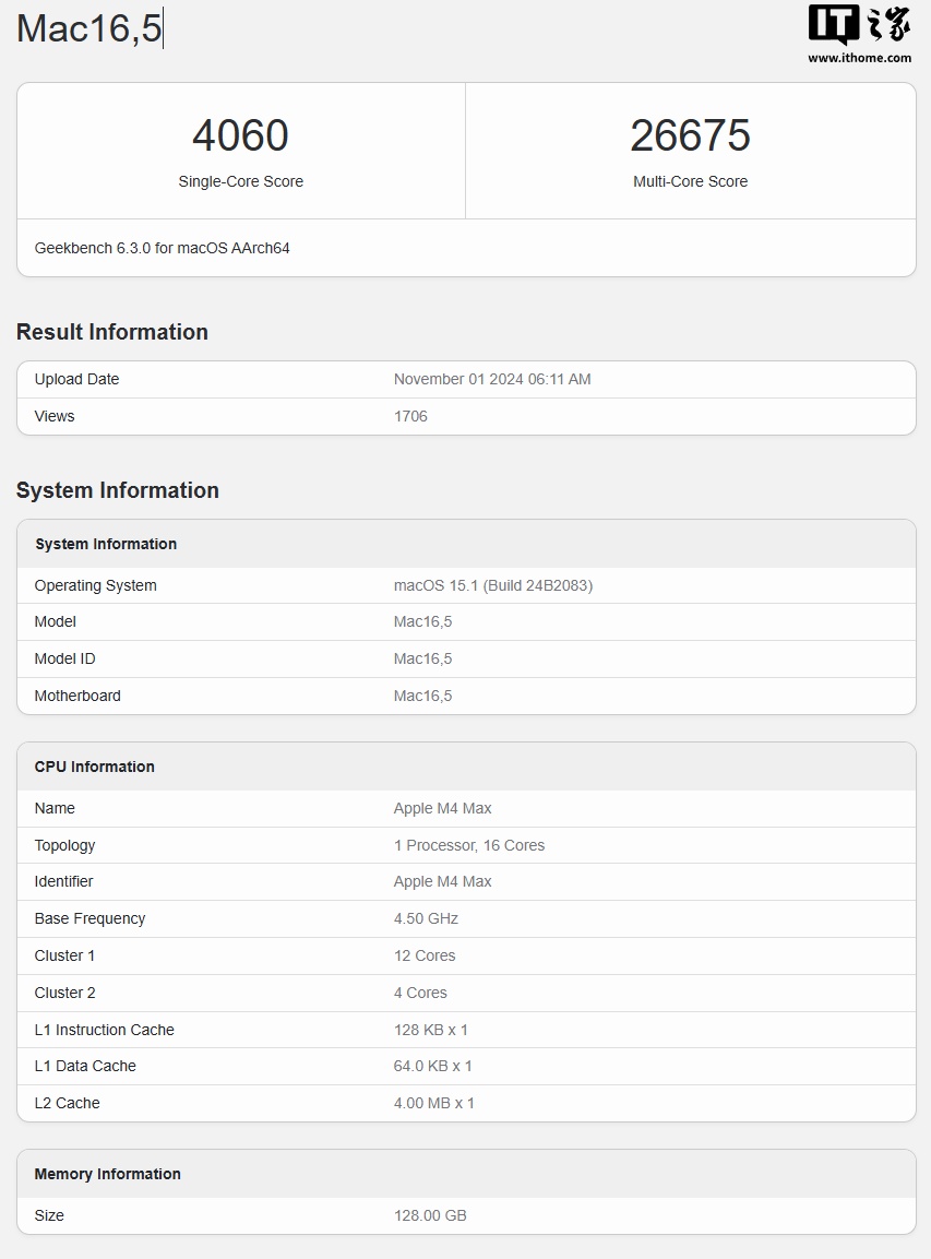 IT之家 11 月 1 日消息,搭载苹果 M4 Max 的 2024 款 MacBook Pro 已经出现在了 Geekbench 上,我们一起来看一下吧。
