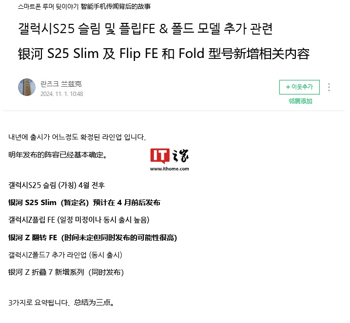 IT之家 11 月 2 日消息,韩国消息源 yeux1122 昨日(11 月 1 日)发布博文,曝料三星公司 2025 年的新品发布计划,包括 Galaxy S25 Slim、Galaxy Z Flip FE 等等。
