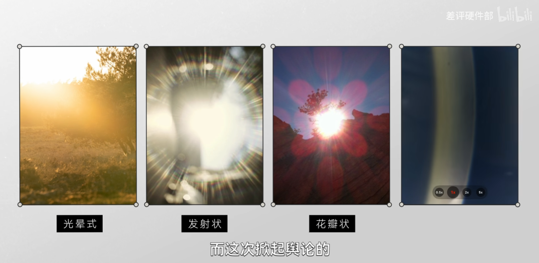 那种与光源形状相似的虚像我们叫鬼影,而那些形成一片明亮区域的我们就叫炫光。炫光有很多种,像光晕式、发射状、花瓣状。而这次掀起舆论的就是画外条状炫光。