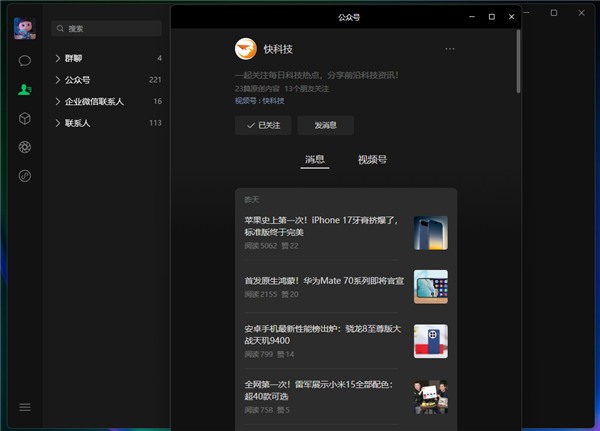 微信PC 4.0版支持Windows和macOS双端,目前可在微信官网下载体验。