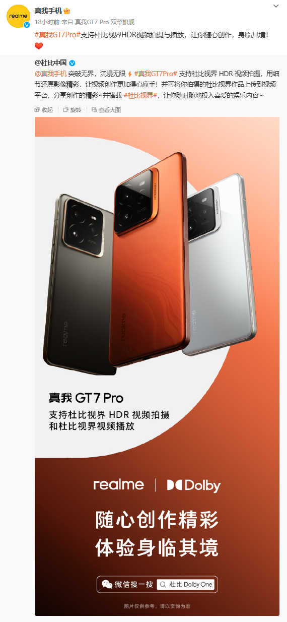 另外,真我 GT7 Pro 手机还支持杜比视界 HDR 视频拍摄和杜比视界视频播放,用户可将拍摄的杜比视界作品上传到视频平台分享。