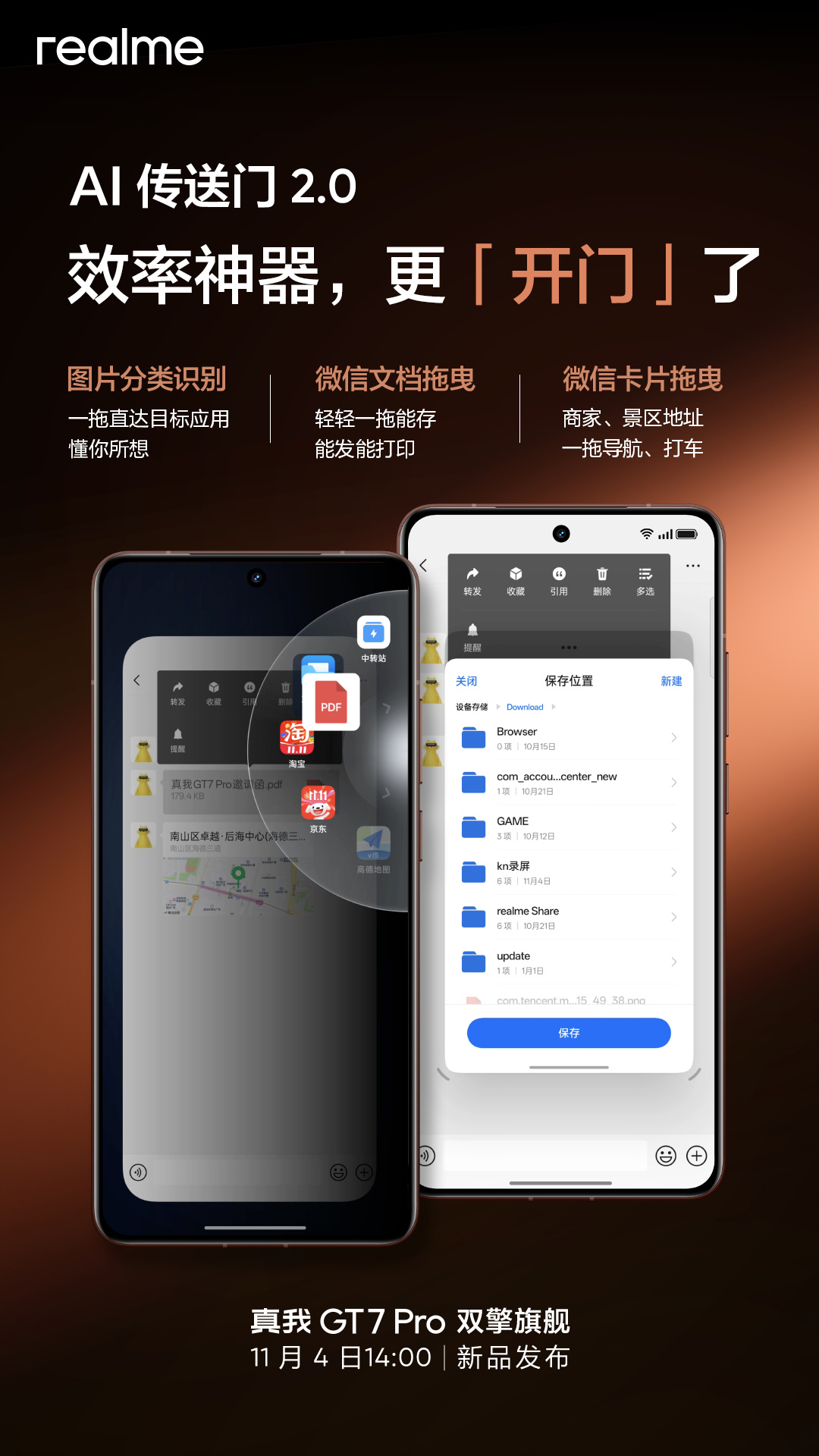 据官方最新预热,realme 真我 GT7 Pro 手机将搭载全新 AI 传送门 2.0 功能,支持图片分类识别(一拖直达目标应用)、微信文件拖曳(能存能发能打印)、微信卡片拖曳(商家、景区地址一拖当行、打车)。