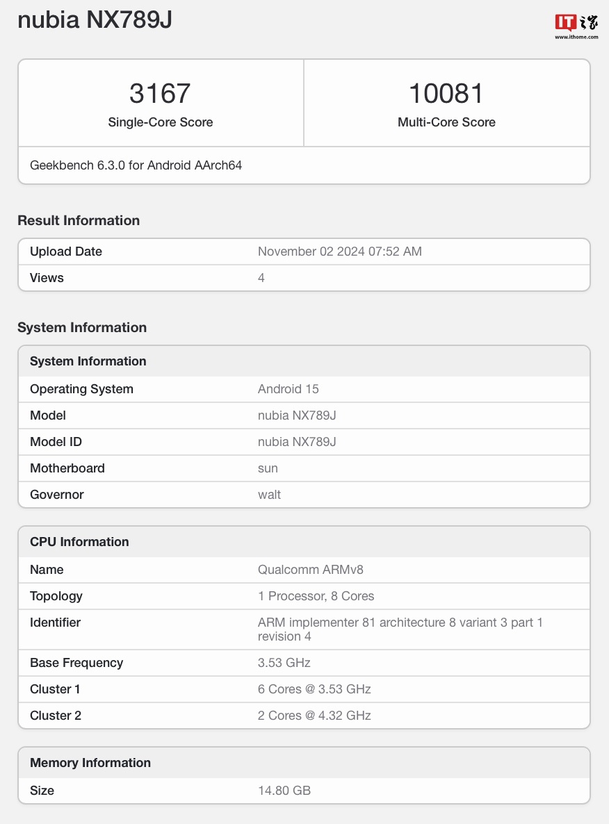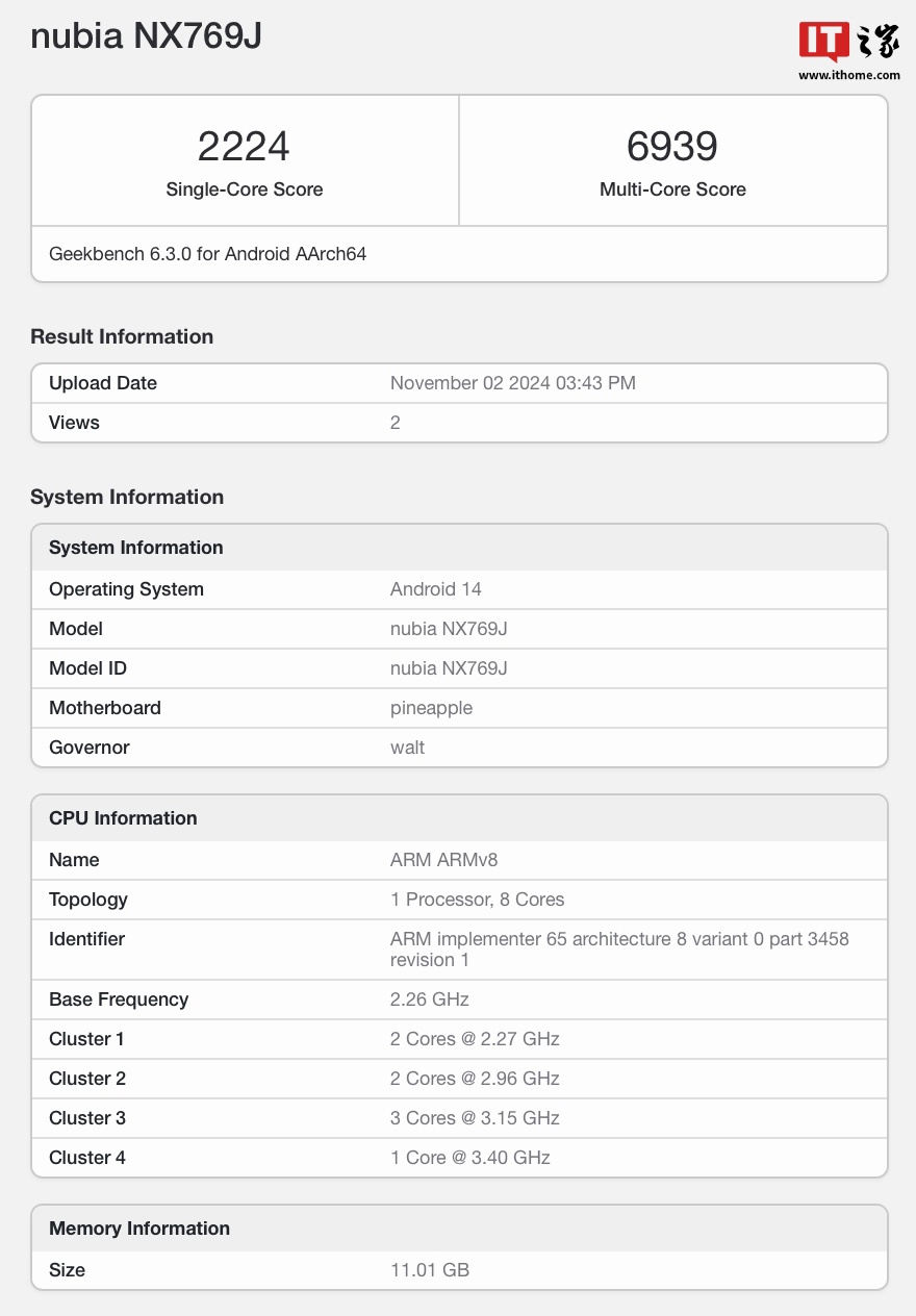 IT之家 11 月 3 日消息,红魔 10 Pro 系列手机现已现身 Geekbench 数据库,系列机型分为 NX769J 和 NX789J 两个版本,预计对应不同配置规格,IT之家整理两款机型规格如下: