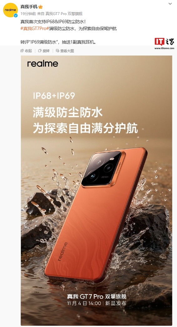 IT之家 11 月 3 日消息,真我手机今日发文宣布,realme 真我 GT7 Pro 将支持 IP68 & IP69 防尘防水(官方宣称真我首次支持 IP68 & IP69 防尘防水)。