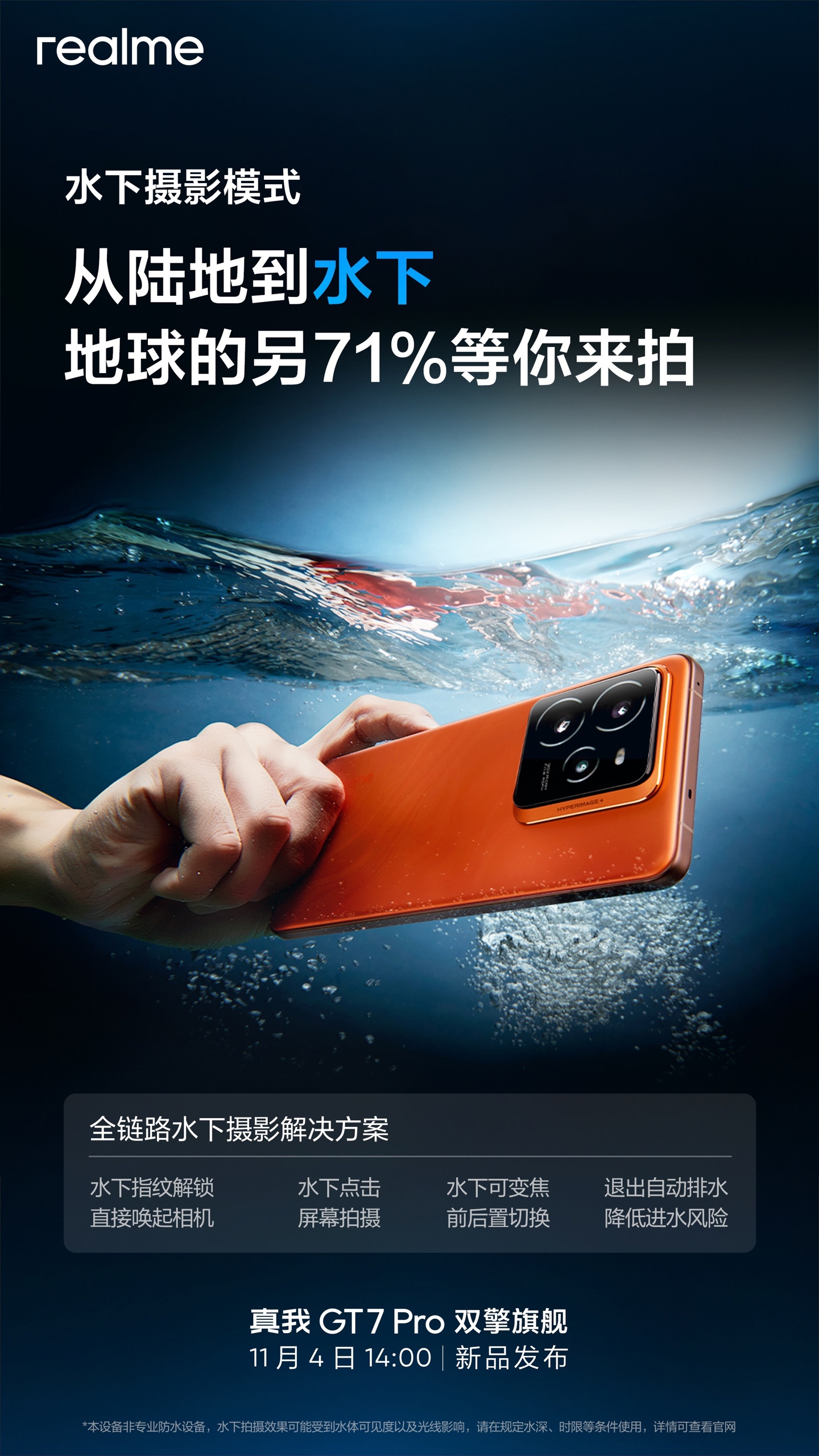 realme 真我 GT7 Pro 手机的水下摄影模式采用全链路水下摄影解决方案,支持水下指纹解锁、水下点击、水下可变焦、退出自动排水、直接唤起相机、屏幕拍摄、前后置切换等功能。