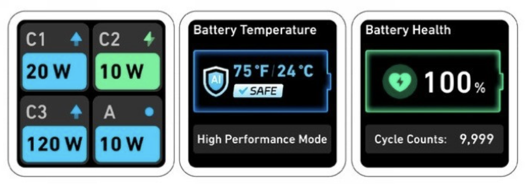 该移动电源采用 3 个 USB-C 和 1 个 USB-A 接口,在单口情况下 USB-C 接口最高输出 165W、USB-A 最高输出 33W;在四口同用的情况下,三个 USB-C 口最高分别是 120W+20W+10W,USB-A 接口为 10W。