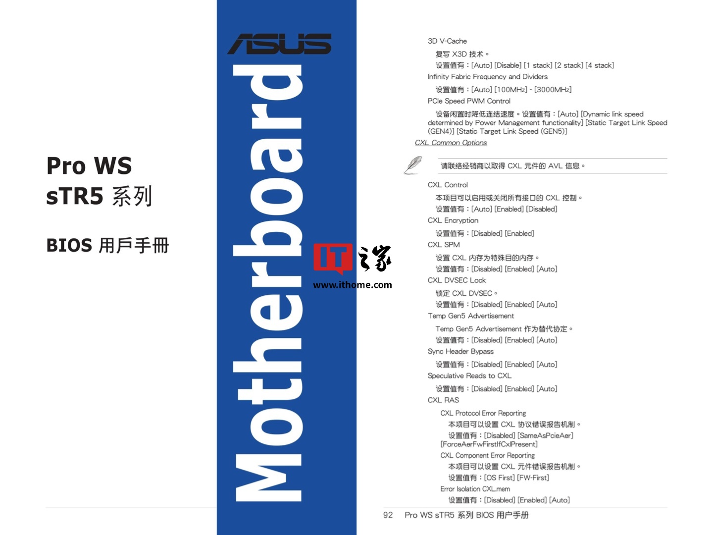 IT之家 11 月 4 日消息,华硕 Pro WS sTR5 系列主板的 BIOS 用户手册中提到了“3D V-Cache”相关选项,这暗示了 AMD 未来为 Zen 5 架构锐龙 Threadripper 线程撕裂者 "Shimada Peak" 处理器推出 X3D 大 L3 缓存版的可能。