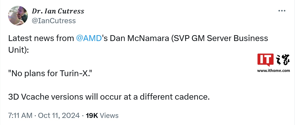 IT之家注意到,AMD 高级副总裁、服务器事业部总经理 Dan McNamara 曾告知海外媒体人 Ian Cutress,AMD 没有推出 Zen 5 架构 EPYC Turin-X 3D V-Cache 服务器处理器的计划。