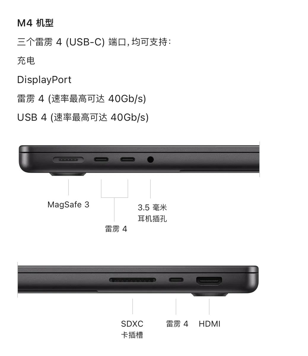 前文说过,USB4 其实分为 20Gbps 和 40Gbps 两种速率,不满足后者的也可以被叫做 USB4 设备,但是同期的雷电 4 是强制要求设备必须可以达到 40Gbps 速率的,因此才会出现需要将两者分别列出的情况。就拿最新发布的 M4 SoC 的 MacBook Pro 为例,Apple 在技术规格页面是把它们俩分别列了出来的: