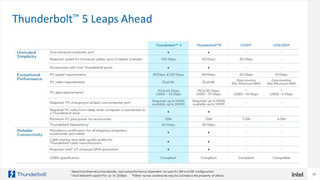 雷电 5 首先支持了双向 80 Gbps 对等传输,为日后更高要求的传输速度打下基础;其次,雷电 5 还可以利用新的可变带宽机制将一路接收信号改为传送,从而实现单向最高 120Gbps 的数据传输速率的同时,还能向另一个方向提供 40Gbps 的带宽。
