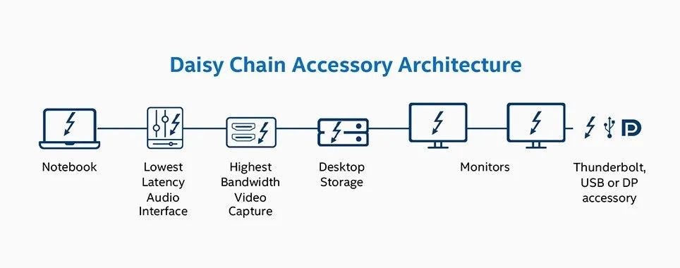 除了单纯传输速率上的区别之外,雷电协议还支持自己独特的菊花链(Daisy Chain)连接模式,即允许通过支持雷电协议的数据线将至多六台雷电设备串联起来,从而显著节省主设备——比如接口有限的笔记本电脑——被占用的接口数量,这也是 USB 标准无法向上涵盖的区别性功能之一: