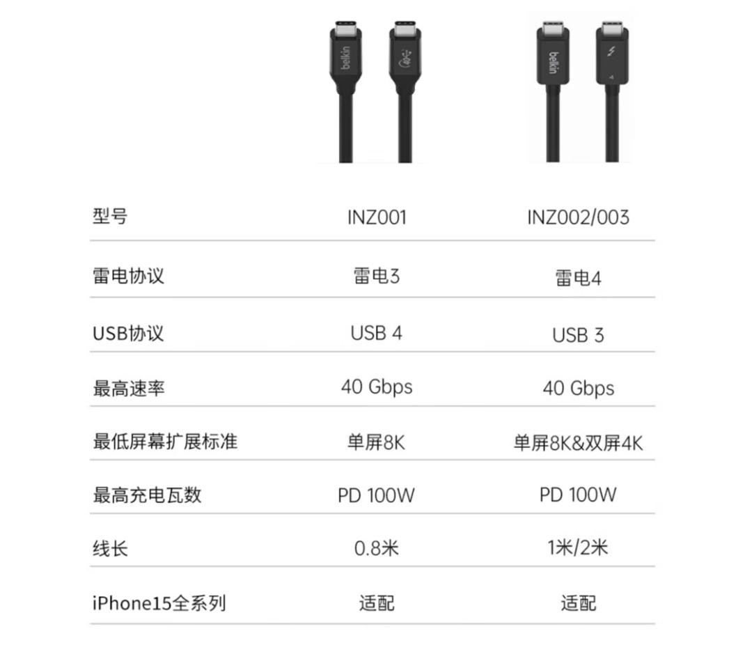 如果你考虑雷电 4 协议的话,贝尔金的 INZ 系列雷电线可能也是个不错的选择,虽然充电功率依然是 100W PD ,但是 1 米的雷电 4 被动线(INZ003)仅需 300 块钱左右,2 米的主动线(INZ002)则为 550 元。