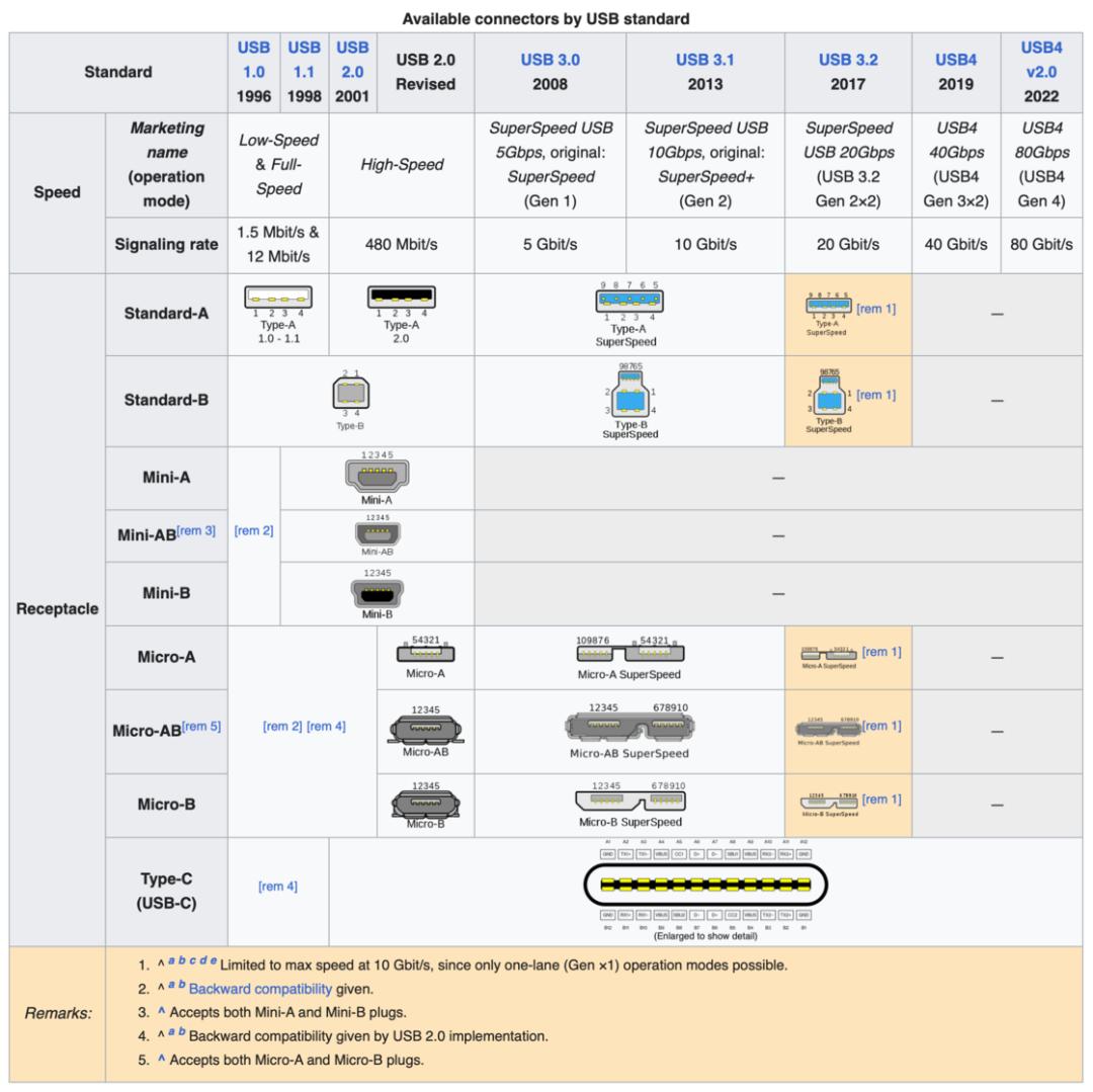 这张维基百科列出的 USB 接口规格表所有的存在过的接口,在 Type-C 这个接口出现以前,每一种 USB 接口的物理样式通常只对应一种(至多两种)USB 传输协议。而且用起来一定要找到两头都对应的线缆才行,所以常常会遇到一抽屉的线材没能用的情况;好处也有,只需要买到接口形状对应的线材或者设备,就可以保证它们之间是可以正常工作——并且是以最大效率、最高兼容性在工作的。