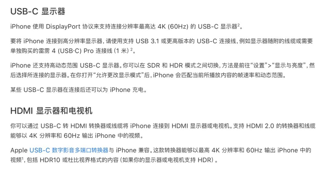 Apple 官网上对于 iPhone 有线视频输出能力的描述
