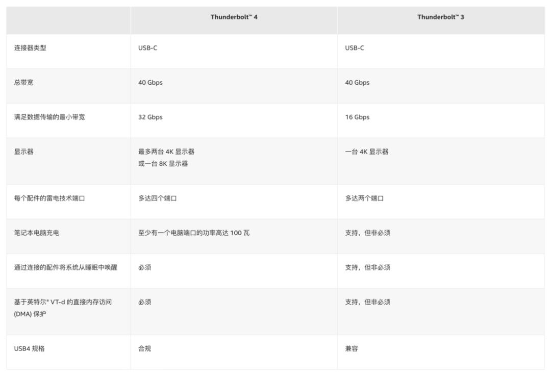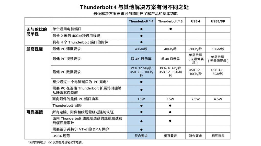 雷电 4 和其他协议的直观对比,图片来自 Intel 中国