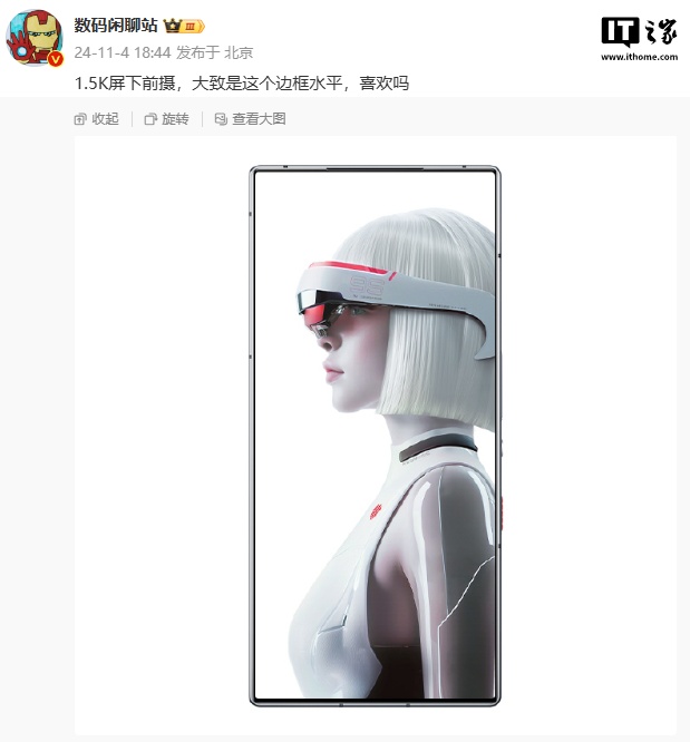 IT之家 11 月 4 日消息,博主 @数码闲聊站 今晚分享了一张红魔新机的正面照,搭载 1.5K 屏下前摄,展示了大致边框水平,预计为红魔 10 Pro 系列手机。