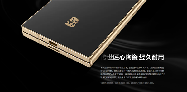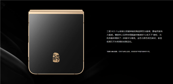 与标准版不同的是,三星W25、W25 Flip手机背部镶嵌具有细腻磨砂触感的“心系天下”徽标,金色与黑色相互映衬,彰显优雅、大气,更具商务气息。