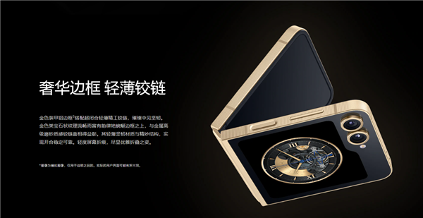 三星W25类宝石状金色浮雕纹理边框与铰链浑然一体,配有精雕细琢的纹路。