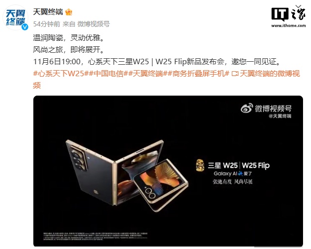 IT之家 11 月 4 日消息,中国电信天翼终端今晚宣布,三星 W25 / W25 Flip 心系天下折叠屏手机新品发布会定档 11 月 6 日 19:00。IT之家注意到,以上两款机型的外观以及部分配置已经在三星官网公布。