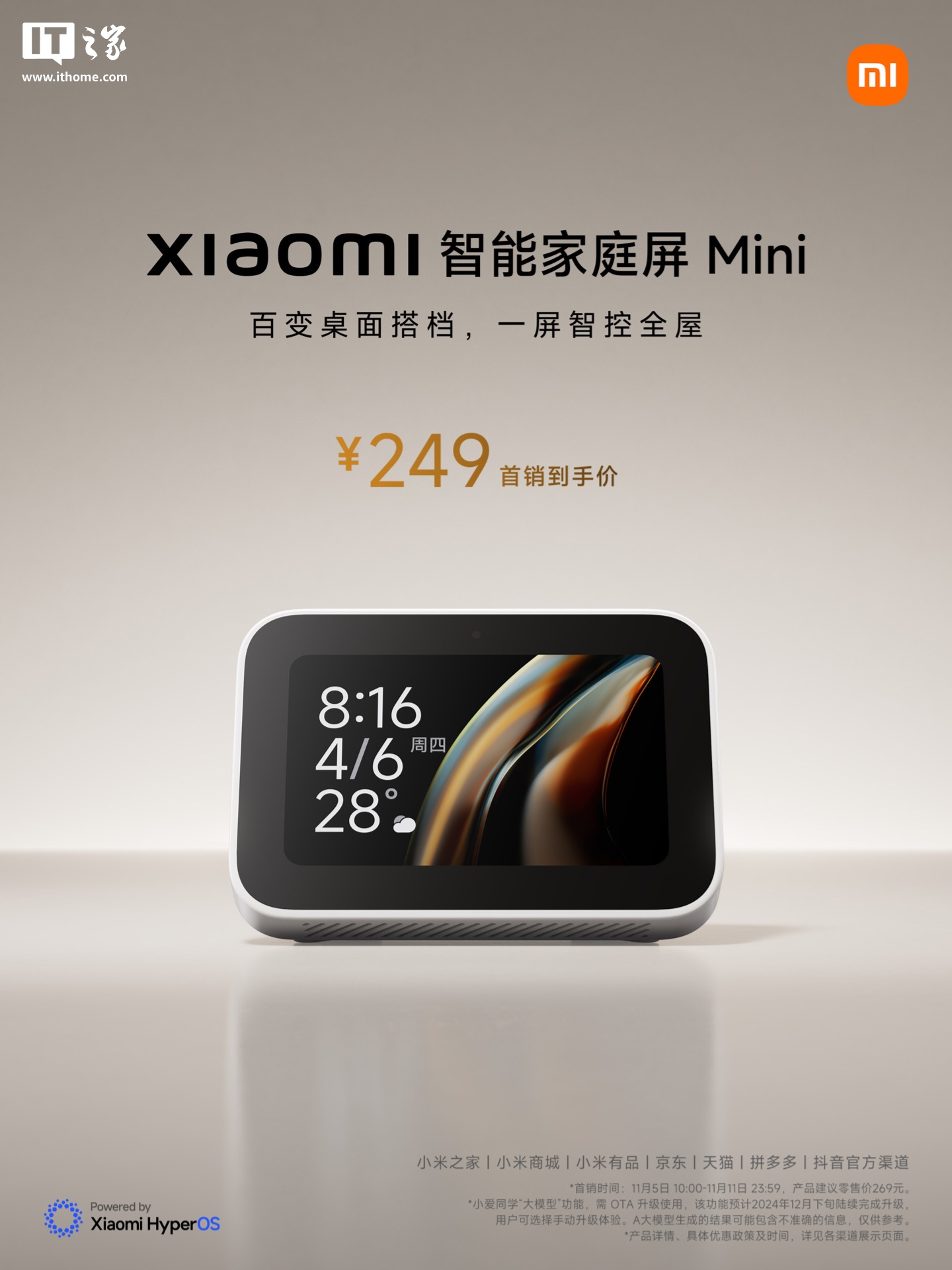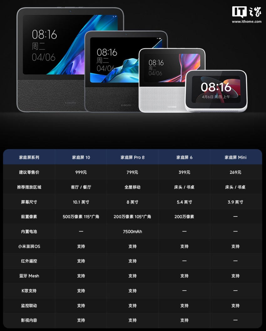 IT之家 11 月 5 日消息,小米智能家庭屏 Mini 今日正式发布,可作为智能家居的控制设备,定价 269 元,首发价 249 元,现已在小米有品开售(点此购买)。