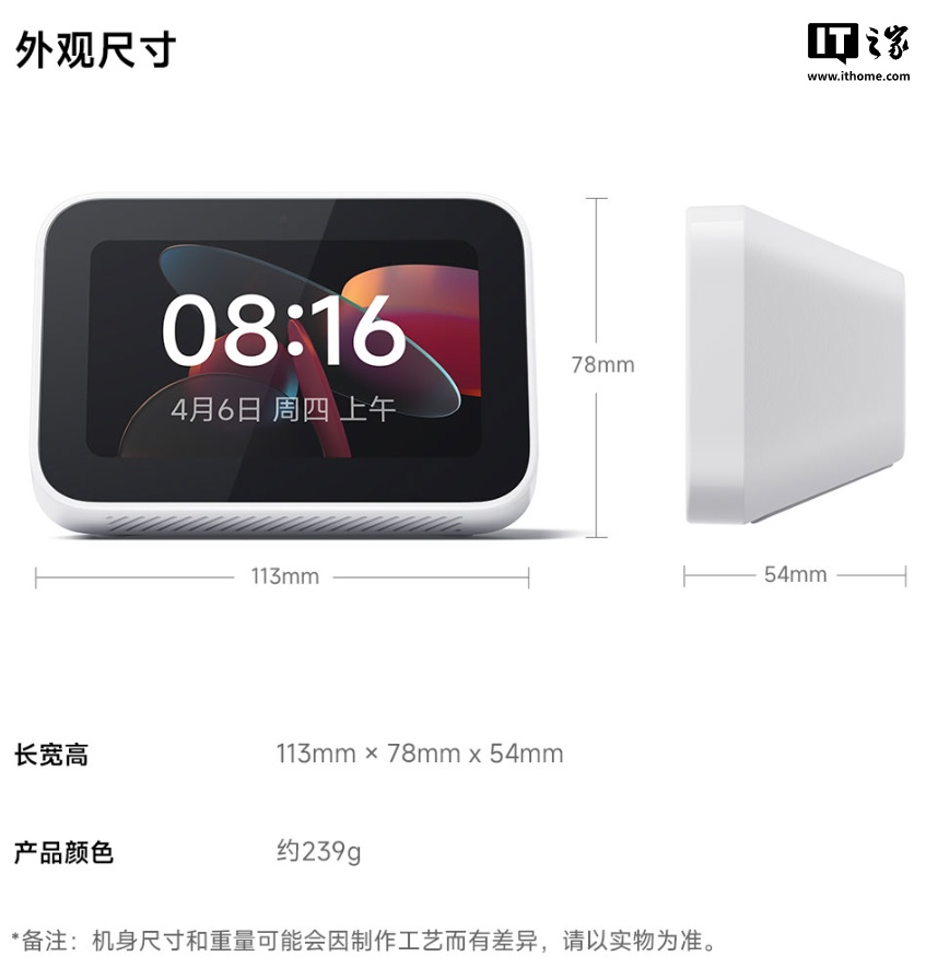小米智能家庭屏 Mini 配备 3.97 英寸 800x480 分辨率全贴合屏,配备双频 Wi-Fi 和蓝牙 5.1,整机重量约 239g,IT之家附参数表如下(点此购买):