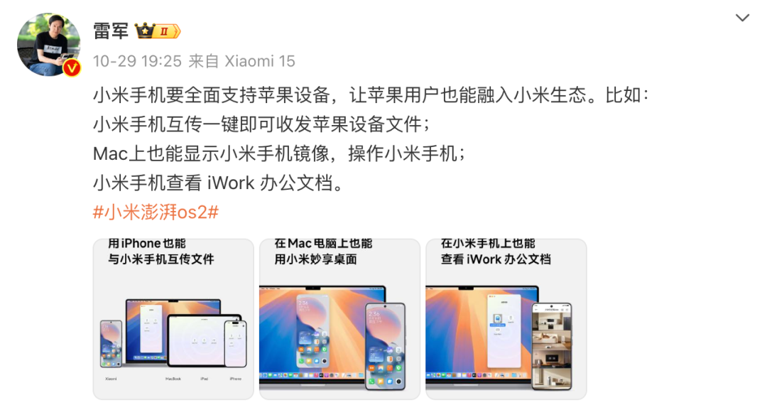 例如,小米在新品发布会上强调HyperConnect全面支持苹果设备,小米手机互传一键即可收发苹果设备文件,查看iWork办公文档,Mac系统上也能显示小米手机镜像。OPPO、vivo等品牌,也在突出和苹果生态的联通。