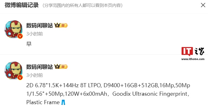 IT之家 11 月 5 日消息,博主 @数码闲聊站 今日发文爆料某厂新机,该机搭载天玑 9400 处理器,配备 6.78 英寸 1.5K 分辨率高刷屏,支持 120W 快充。结合爆料的暗示标志及评论区讨论来看,该机预计为 iQOO Neo10 Pro。