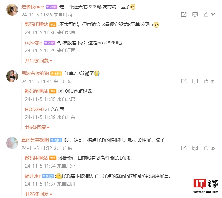 博主在评论区中回复了部分网友的问题:针对新机价格是否为 2299 元,博主称“不太可能,但盲猜会比最便宜骁龙 8 至尊版便宜”;针对红魔 Ultra 机型被辟谣,博主回复“X100U 也辟过谣”;针对 LCD 屏的新机情况,博主表示“很遗憾,目前没看到高性能 LCD 新机”。