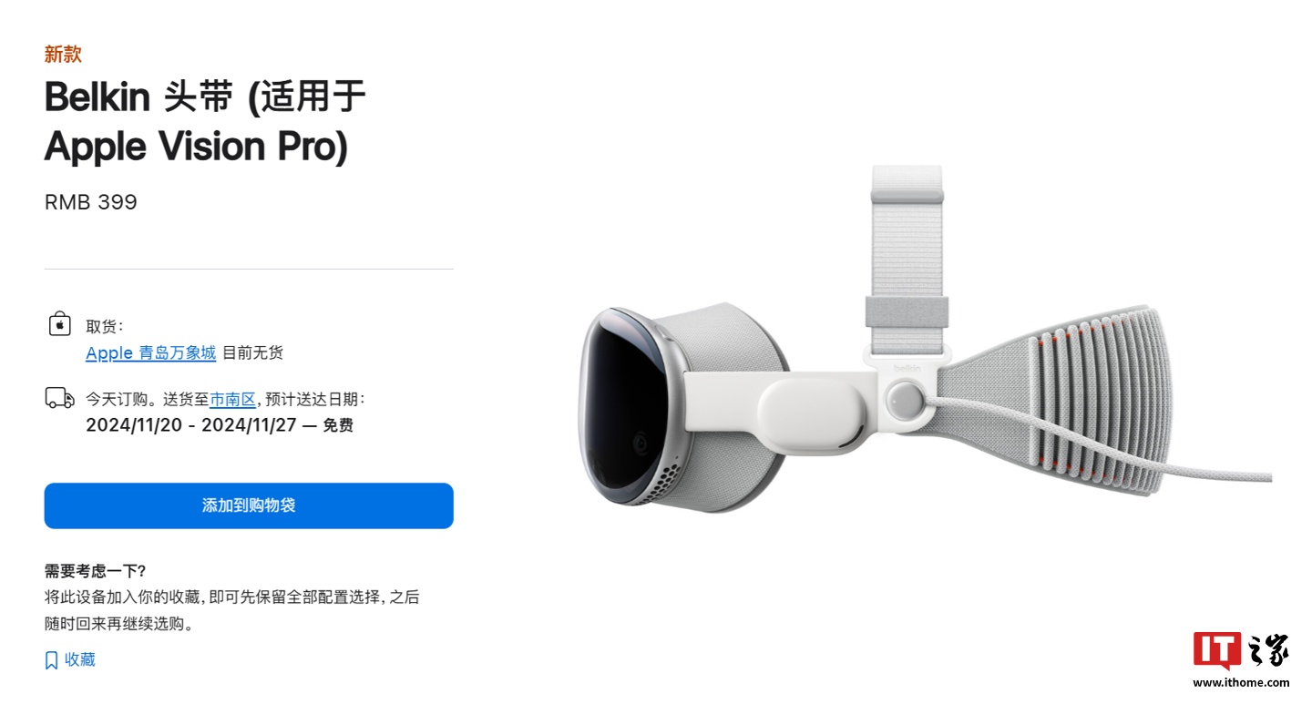 IT之家 11 月 5 日消息,苹果官网上架了适用于 Apple Vision Pro 的 Belkin(贝尔金)头带,售价 399 元。