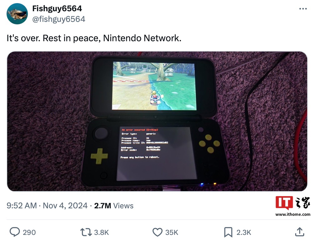 在 11 月 4 日(昨天),这名玩家 Fishguy6564 在 X 平台发帖,宣布由于游戏故障,他不得不退出在线服务器,“这切终于结束了”,这也意味着任天堂 3DS、Wii U 的在线服务器在官宣“关闭”7 个月后实质性正式关闭。