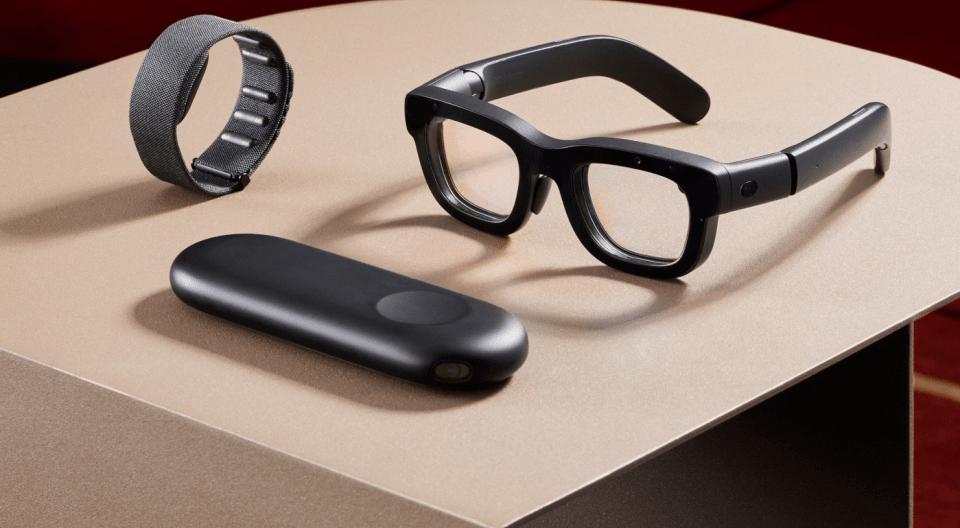 Orion一共由三个部分组成:眼镜本体,一个手势追踪腕带,以及一个遥控器大小的计算模块,三者无线连接。从眼镜本体来看,Orion的镜框由镁合金制成,它比铝合金更轻,也更容易散热。镜片由碳化硅制成,它耐用、重量轻、折射率高,这使得眼镜上投影仪发射的光线可以扩展到更大的视野面积。