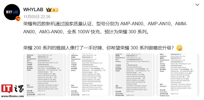 结合博主 @WHYLAB 消息和网友讨论,此次通过认证的新机有望全系支持 100W 快充,预计为荣耀 300 系列。