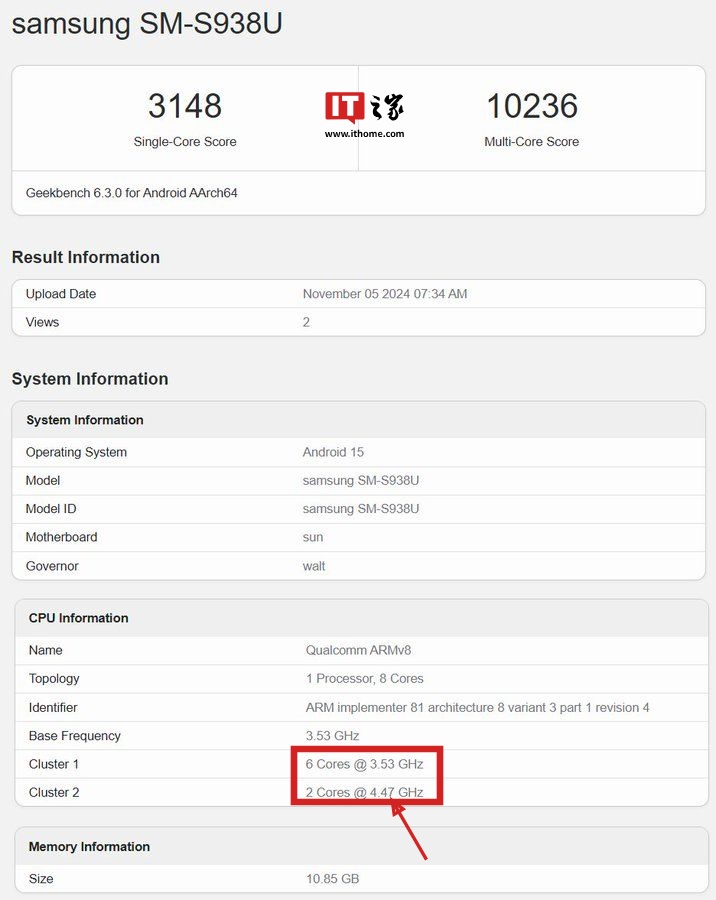 IT之家 11 月 6 日消息,美版三星 Galaxy S25 Ultra 手机再次现身 GeekBench 跑分库,6.3.0 版本单核成绩为 3148 分,多核成绩为 10236 分。