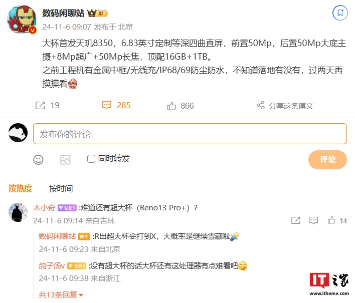 结合过往爆料及评论区讨论来看,新机预计为 OPPO Reno 13 Pro 手机。针对系列新机是否会推出超大杯(即 Pro + 机型),博主表示“R 出超大杯会打到 X,大概率是继续雪藏”。