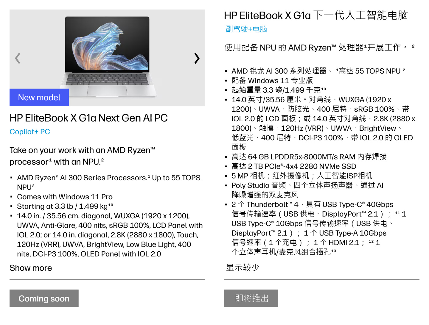 EliteBook X G1a 配备 14.0 英寸显示屏,搭载 AMD 锐龙 AI 300 系列处理器,NPU 算力最高可达 55 TOPS(IT之家注:即可选配锐龙 AI 9 HX 375),起始重量为 1499g。