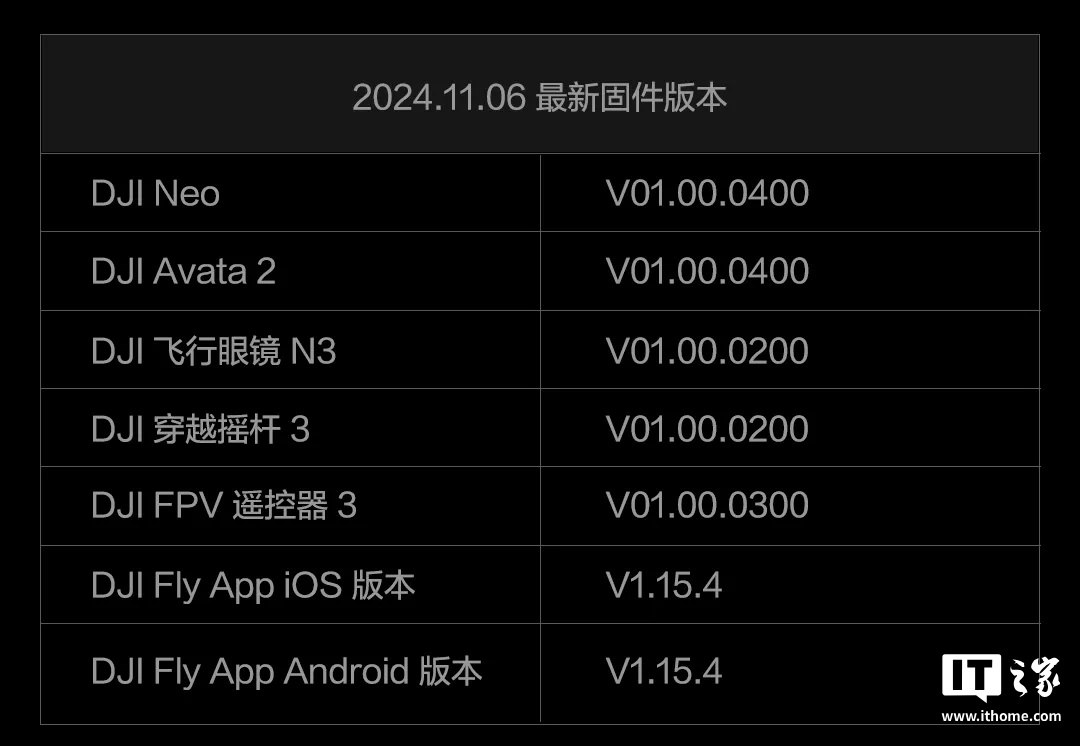IT之家 11 月 6 日消息,大疆今晚宣布,向 DJI Neo 和 DJI Avata 2 发布 V01.00.0400 新固件。