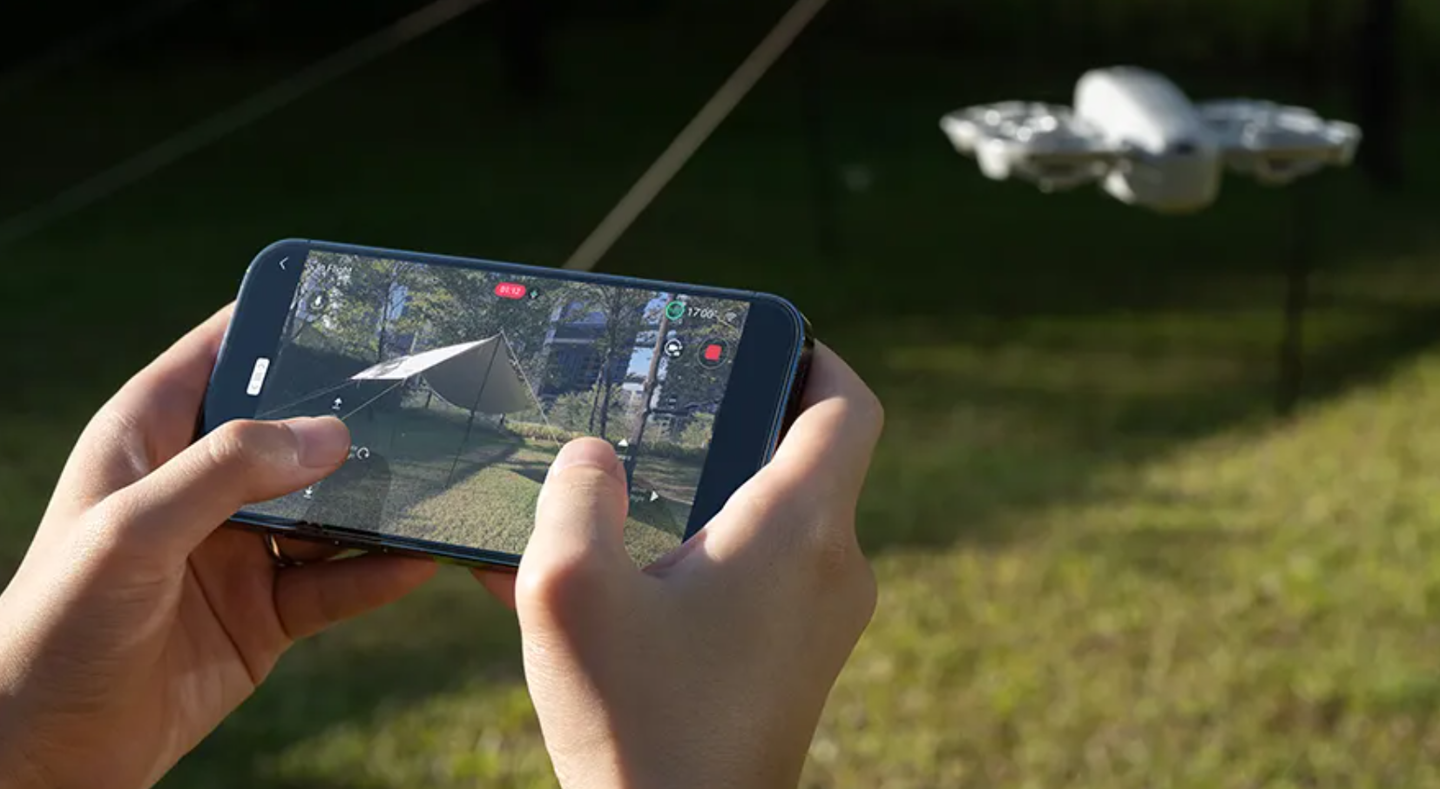 支持横屏、竖屏两种操控方式:DJI Neo 支持在 App 内切换横屏和竖屏两种方式操控无人机,也可查看实时图传画面,并调整跟拍的角度与距离