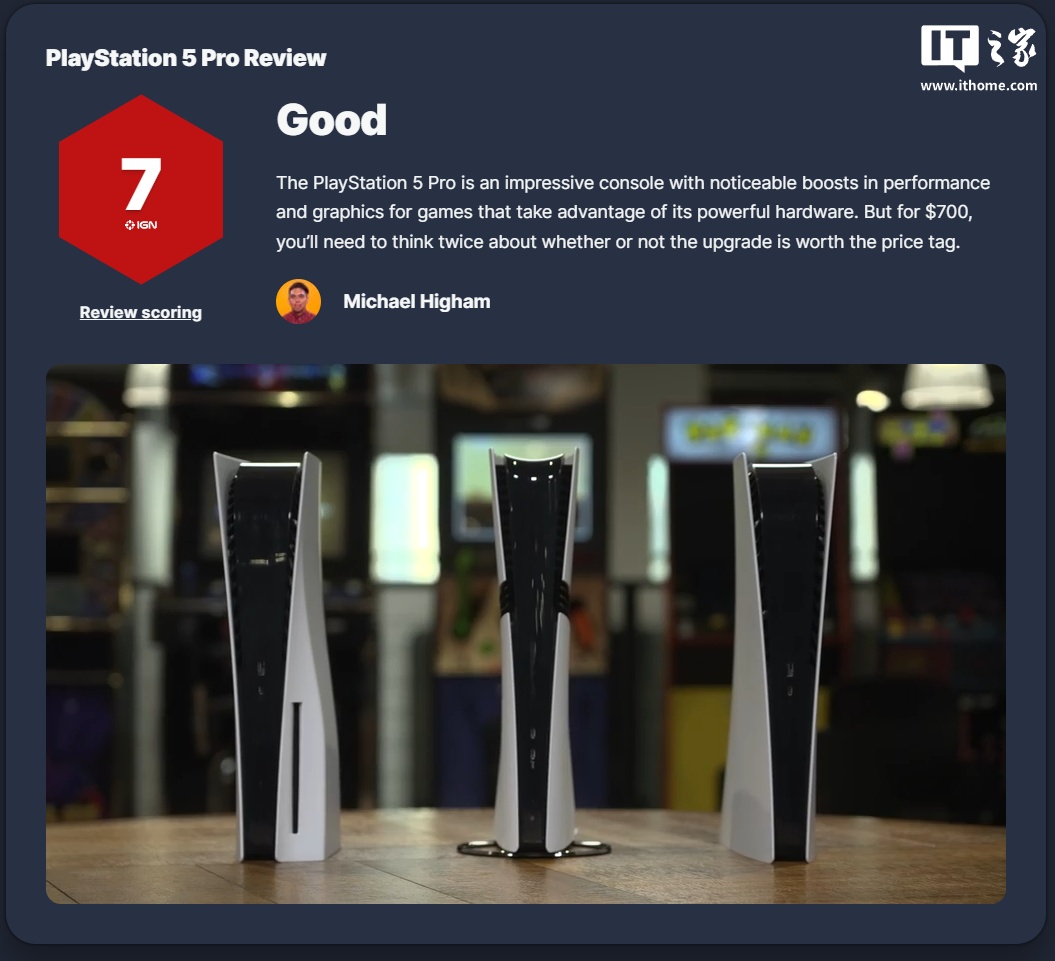 IT之家 11 月 6 日消息,北京时间今晚,IGN 发布了索尼 PS5 Pro 游戏主机的评测报告,其得到了“7 / Good”的评价。