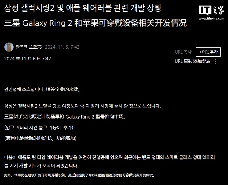 IT之家 11 月 7 日消息,消息源 yeyx1122 昨日发布博文,曝料三星正加速开发 Galaxy Ring 2 智能戒指,主要是削薄厚度、延长续航时间以及增加更多功能。