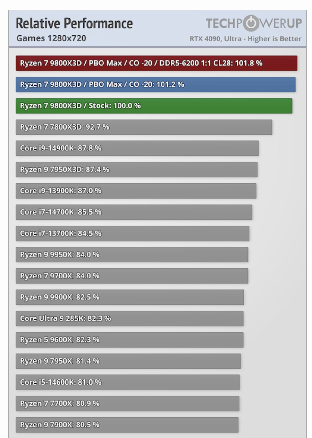 此外,游戏平均帧数相比上代 X3D 产品提升达到 8%,在许多游戏(如《星球大战:亡命之徒》)中的提升更是达到 10% 以上。更重要的是在相似的平均帧速率环境下,锐龙 7 9800X3D 游戏处理器可以在 1% LOW 帧率 (1% 低帧率) 方面表现出更显著的代际提升。