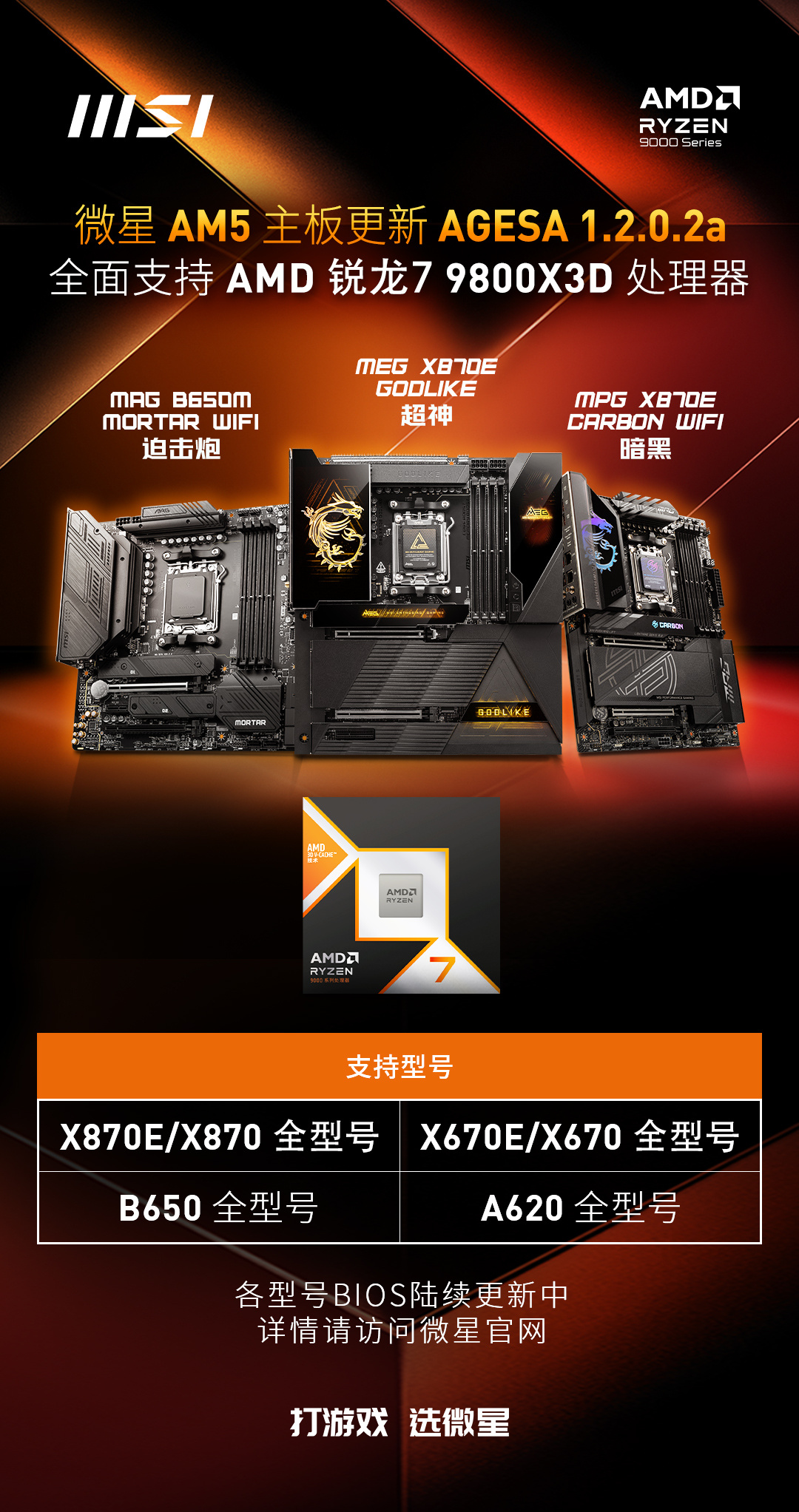 IT之家 11 月 8 日消息,随着 AMD 锐龙 7 9800X3D 处理器正式上市,微星宣布为旗下 AMD5 主板陆续推出最新的 AGESA 1.2.0.2a BIOS 更新,大家可以通过官网进行查询下载。