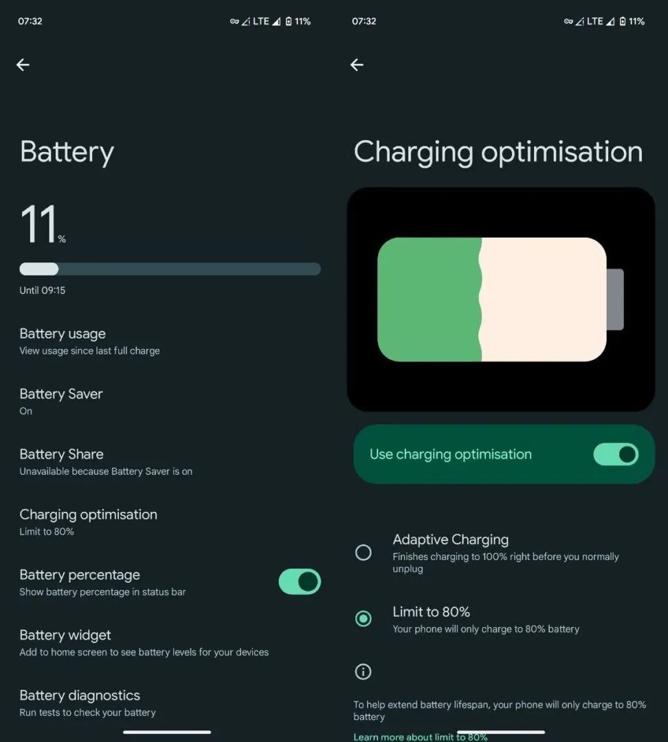 用户启用后,Pixel 手机将仅充电至最大容量的 80%,有助于延长电池使用寿命。