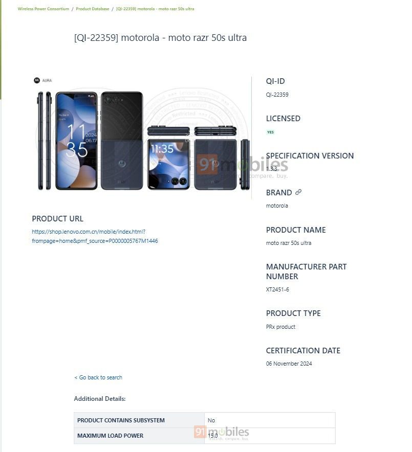IT之家 11 月 8 日消息,科技媒体 91Mobile 昨日(11 月 7 日)发布博文,报道称摩托罗拉 Razr 50s Ultra 手机通过无线电源联盟认证,显示支持 15W 无线充电。