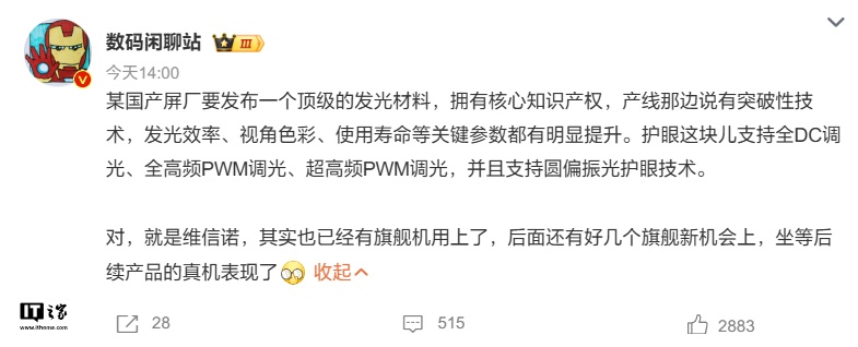 而在今天下午,博主 @数码闲聊站 发文透露,维信诺要发布一个拥有知识产权的“顶级发光材料”,产线称有“突破性技术”,在发光效率、视角色彩、使用寿命等关键参数上都有明显提升。护眼方面,其支持全 DC 调光、全高频 PWM 调光、超高频 PWM 调光,并且支持圆偏振光护眼技术。