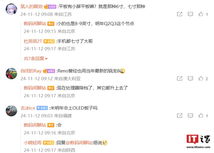 博主在评论区中回复了部分网友疑问:针对小屏平板的发布时间,博主回复“小的也是 8-9 英寸,明年 Q2、Q3 这个节点”。;针对 Reno 系列新机性能情况,博主称“现在处理器降档了,其它都升上去了”;针对小米平板是否会使用 OLED 屏,博主直言“会”。