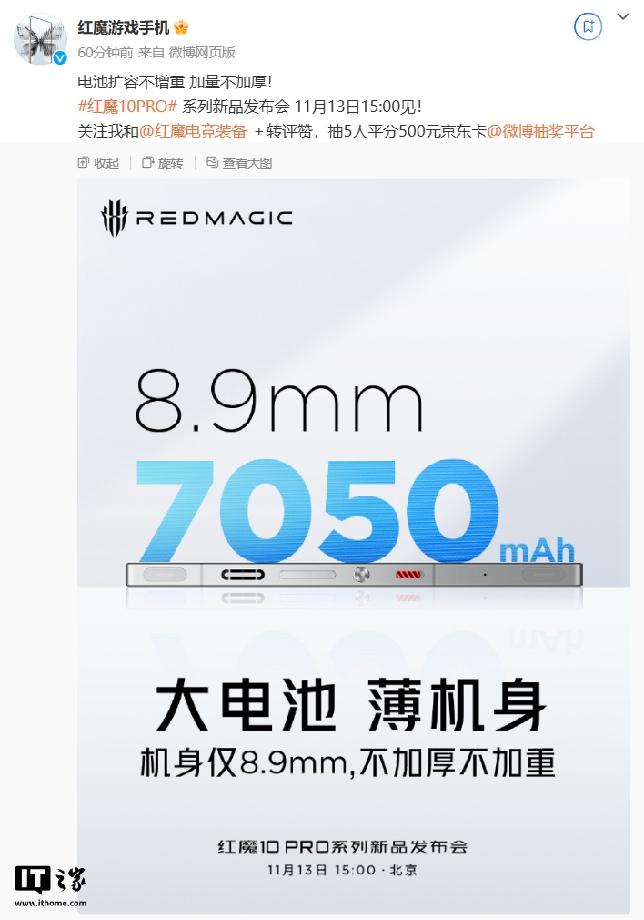 IT之家 11 月 12 日消息,红魔游戏手机官方今日宣布,红魔 10 Pro 将行业首发 7050mAh“牛魔王”电池,搭载 ETT 隧道技术、新一代硅碳负极电池技术、魔方 AI 电源管理三大核心技术。