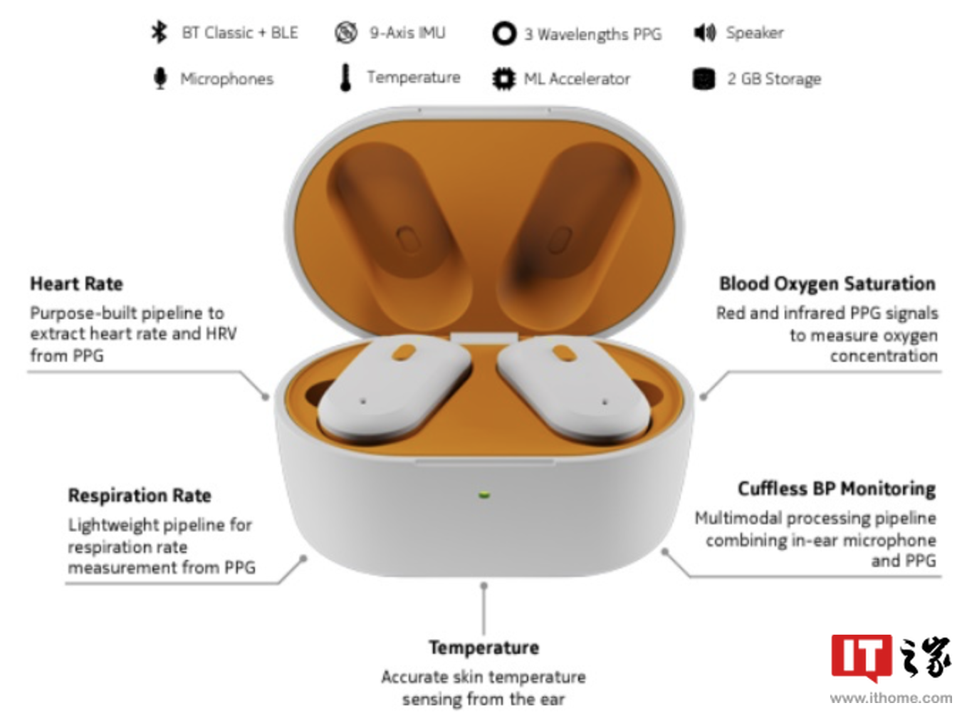 诺基亚贝尔实验室暂时没有公布这款耳机的完整规格细节,仅表示 OmniBuds 配备了多个生物传感器,包括 ML 加速器、9 轴 IMU 等,搭载 RTOS,其能够利用多模态技术测量用户的各种健康信息,同时保证六小时的聆听音乐续航基础体验。