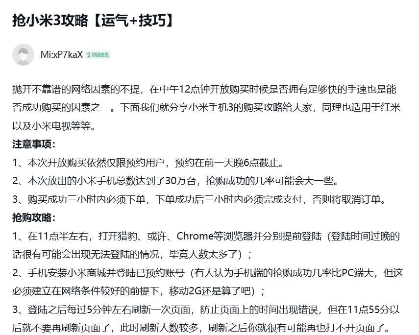 “抛开不靠谱的网络因素不提,在中午12点开放购买时能否拥有足够快的手速也是能否成功购买的因素之一。”小米社区里的大神会在小米手机开售前提供抢购手机的注意事项和抢购攻略。