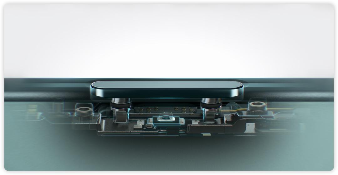 我们可以将这颗按键的交互方案分成两套结构: 一套是通过机械结构实现点按激发,另一套则是通过用于屏幕上的电容感应与压力传感器来实现触摸与按压激发。